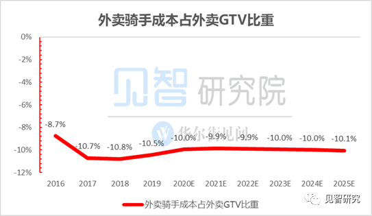 而到了今年一季度,骑手成本占外卖GTV的比重只有9.8%。