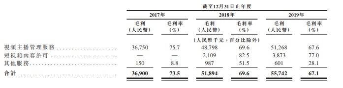 于2017年、2018年及2019年,该企业来自其他服务的收入分别为人民币170万元、人民币191.7万元及人民币214.2万元,分别占同期该企业总收入的3.4%、2.6%及2.5%。该企业主要通过分享直播活动或短视频产生的产品销售的佣金或来自品牌所有者及第三方商家的广告费产生收益。该企业亦与主播分享彼等从线下表演活动中产生的部分收入。另外,该企业通过向第三方主播公会转让主播赚取转让费。