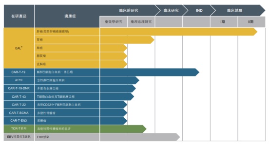 根据公司用于治疗血液癌症的CAR-T-19注射液在研产品模型,公司正研究旨在克服肿瘤微环境中免疫抑制机制的新型T细胞产品(如CAR-T-19-DNR),以及旨在克服CAR-T细胞治疗的高復发率的产品(如aT19)。就公司的TCR-T细胞产品管线而言,公司有若干在研产品正进行临床前研究。公司已经完成NY-ESO-1TCR-T细胞在研产品的药效研究。公司计划于2021年中前为CAR-T-19-DNR、aT19及NY-ESO-1TCR-T在研产品提交IND申请。