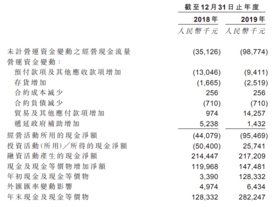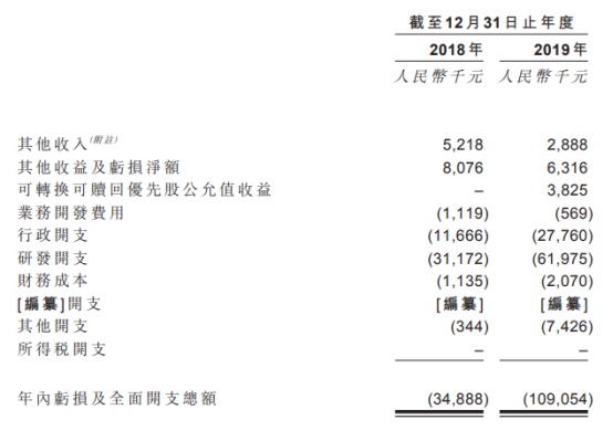 于往绩记录期间,公司并无产生任何收益,而公司的亏损主要来自公司的研发及行政开支。2019年,公司年内亏损及全面开支总额为1.09亿人民币(单位下同),2018年亏损3488.8万;研发开支则由18年的3117.2万扩大至6197.5万。