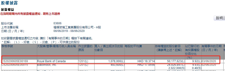 智通财经APP获悉,联交所最新资料显示,6月3日,Royal Bank of Canada减持福耀玻璃(03606)约107.8万股,每股作价18.3714港元,总金额约为1980.44万港元。减持后最新持股数目约为5017.76万股,最新持股比例为9.92%。