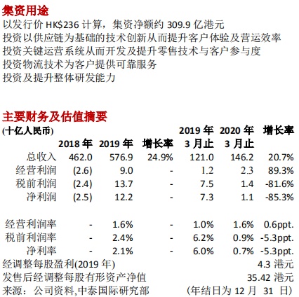 估值水平:按全球公开发售后的 30.9 亿股本计算,公司市值为 7,293 亿港元,高于港股同业平均水平。 20 年公司动态市盈率约为 45.47倍、市销率约为 0.87倍,综合考虑电商、传统零售商同业估值及公司历史估值水平,京东此时处于合理偏低位置。此次稳价人为美林美银,19 年共计4个项目,首日表现3涨1跌。