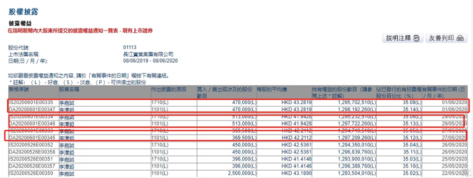 智通财经APP获悉,联交所最新资料显示,5月27日、29日及6月1日,李嘉诚及李泽钜三日增持长实集团(01113)共135.25万股,每股平均作价分别为42.2112港元、41.9428港元及43.2819港元,总金额约为5745.62万港元。增持后,李嘉诚最新持股数目约为12.96亿股,最新持股比例为35.08%;李泽钜最新持股数目约为12.98亿股,最新持股比例为35.14%。