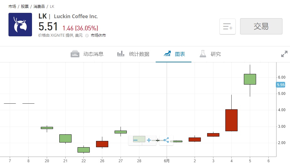 瑞幸股价近期连续上涨,最新价格较5月26日的最低价1.33美元已上涨384%。