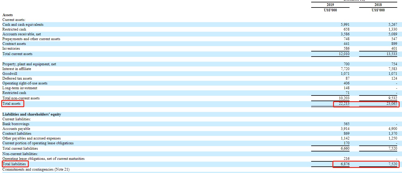 截至2019年12月31日,公司总资产为2221.3万美元,去年同期为2306.5万美元;公司总负债为687.6万美元,去年同期为752万美元。