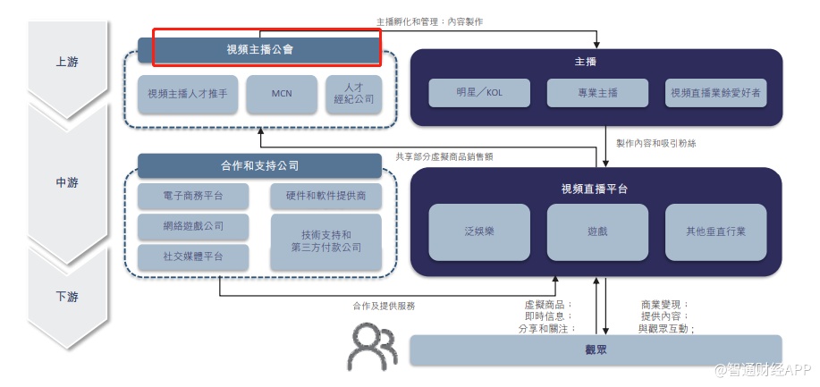 而从产业链的角度来看,视频主播公会属于视频直播行业的上游,为视频直播行业源源不断的输送直播人才。