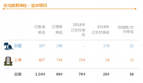 相配套的棠岸房地产项目销售良好,2019年已交付28套公寓及196间别墅予客户,与物业销售额小关的34.33亿元合约负债已确认为2019年收入。且在已预售的984套物业中,剩余2套公寓和14套别墅预计将根据相关法律法规的规定在所有权转让后进行交付,235个公寓及10个别墅由复星旅文旗下爱必侬品牌签约管理。