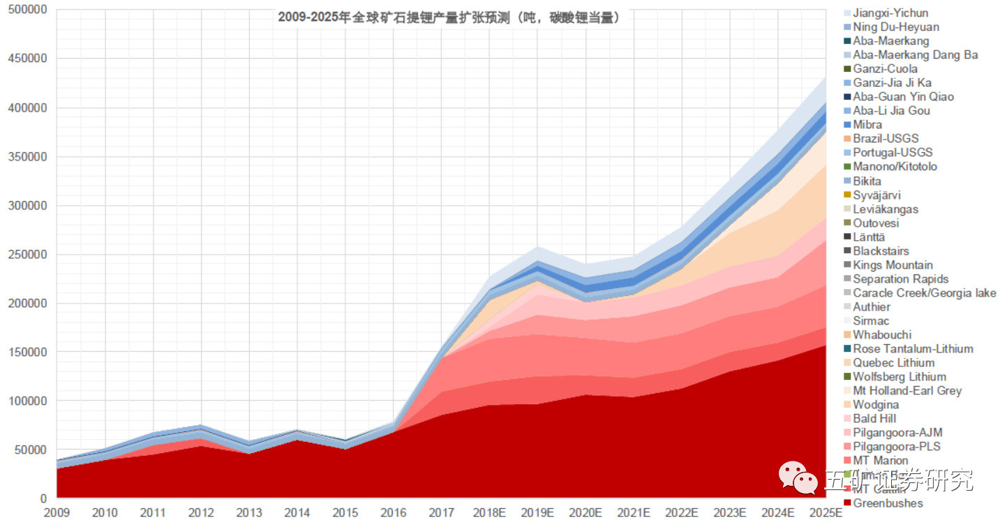 自2015年来,全球锂资源新增产量中70%来自矿石锂。我们测算2015-2019年全球矿石锂产量(精矿形式)从6.1万吨LCE大幅增长至25.8万吨LCE,同时全球盐湖锂产量从9.7万吨LCE增长至17.8万吨LCE。由于采选流程易复制、产量爬坡较快,矿石锂快速响应了全球需求的增长。本报告我们聚焦矿石锂资源,分析覆盖了全球38个具备代表性的建成、待开发矿山。