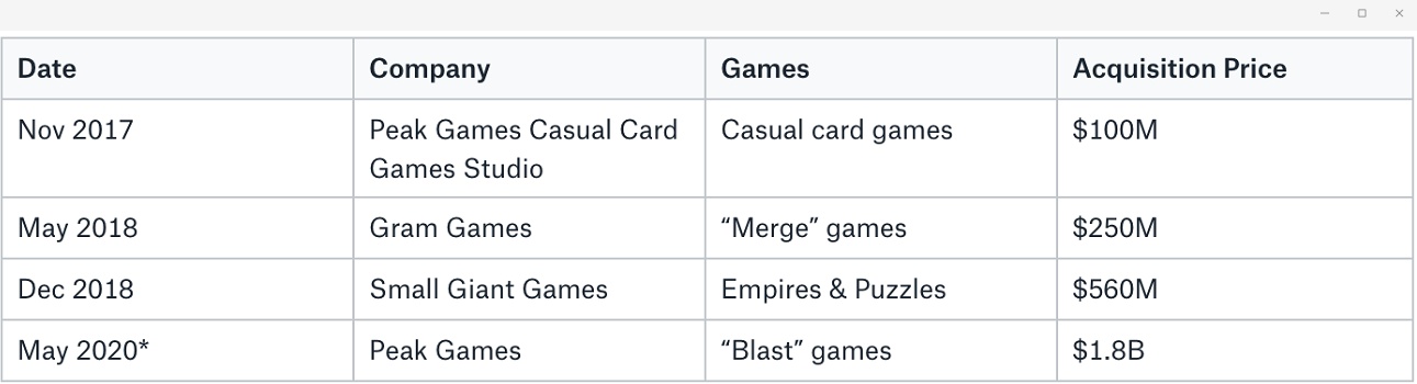 另一方面,曾一度濒临破产(或至少平庸)的Zynga,在过去几年,通过一系列高增值的收购,取得了令人难以置信的增长。