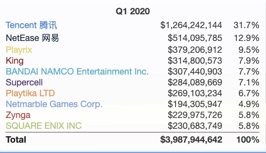 根据Sensor Tower的数据,如果按2019年手机游戏收入来看,排名前10的手游发行商,在2020年第一季度市场份额如下: