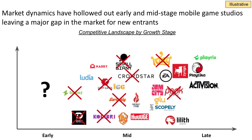 但是,还剩下多少中型手游公司被Zynga收购呢?我认为,并不多。此外,依赖于通过收购高增值标的实现增长是非常冒险的。下图是当前市场厂商动态:有价值的早期和中期手游厂商已所剩无几。