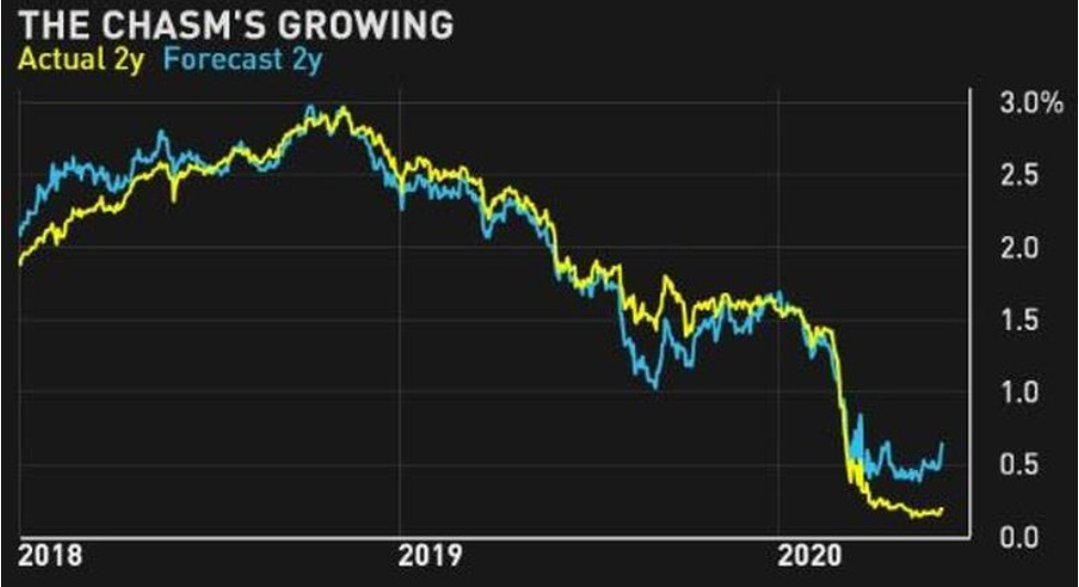 至少自2018年初以来,预测值和实际值之间的差异从未如此明显。这反映了人们对经济低迷、美联储开始控制收益率曲线的前景以及负利率的担忧。