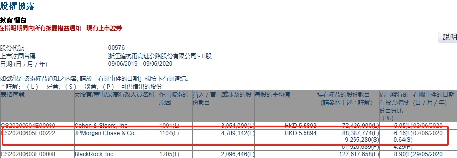 智通财经APP获悉,联交所最新资料显示,6月2日,小摩增持浙江沪杭甬(00576)约478.91万股,每股作价5.5894港元,总金额约为2676.84万港元。增持后最新持股数目约为8838.78万股,最新持股比例为6.16%。