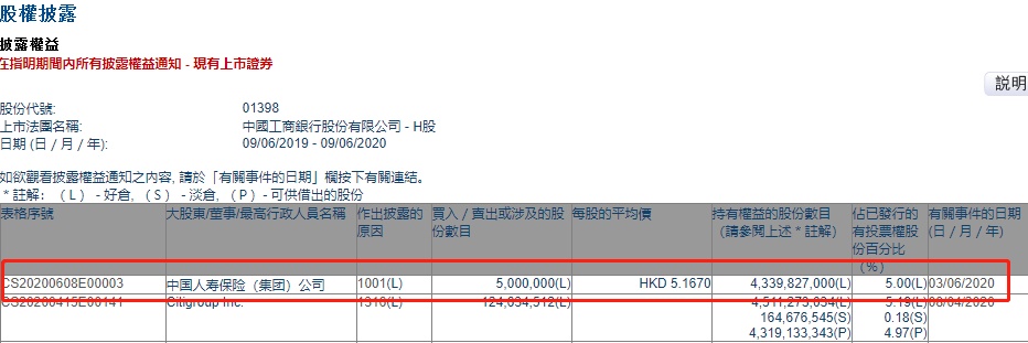智通财经APP获悉,联交所最新资料显示,6月3日,中国人寿保险(集团)公司增持工商银行(01398)约500万股,每股作价5.167港元,总金额约为2583.50万港元。增持后最新持股数目约为43.40亿股,最新持股比例为5%。
