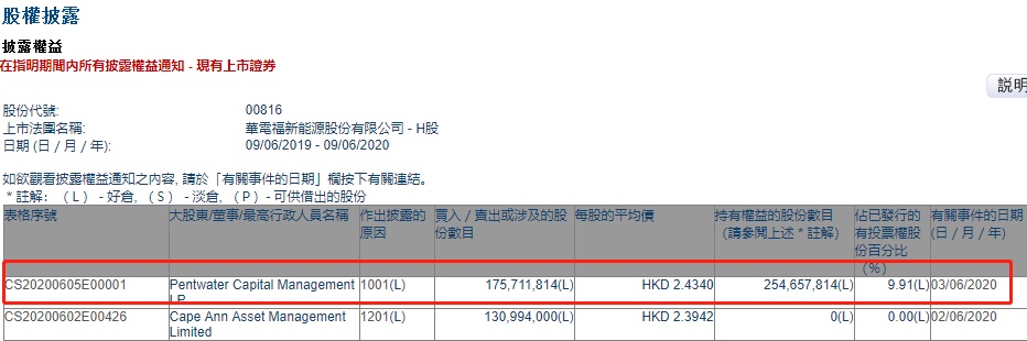 智通财经APP获悉,联交所最新资料显示,6月3日,Pentwater Capital Management LP增持华电福新(00816)约1.76亿股,每股作价2.434港元,总金额约为4.28亿港元。增持后最新持股数目约为2.55亿股,最新持股比例为9.91%。
