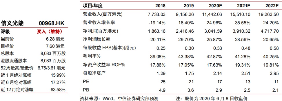 信义光能(00968)公司预计2020H1归母净利润同增35%-50%,增幅符合预期,维持2020-2022年EPS预测为0.38/0.48/0.58港元,现价对应PE为17/13/11倍,上调目标价至7.60港元,维持“买入”评级。