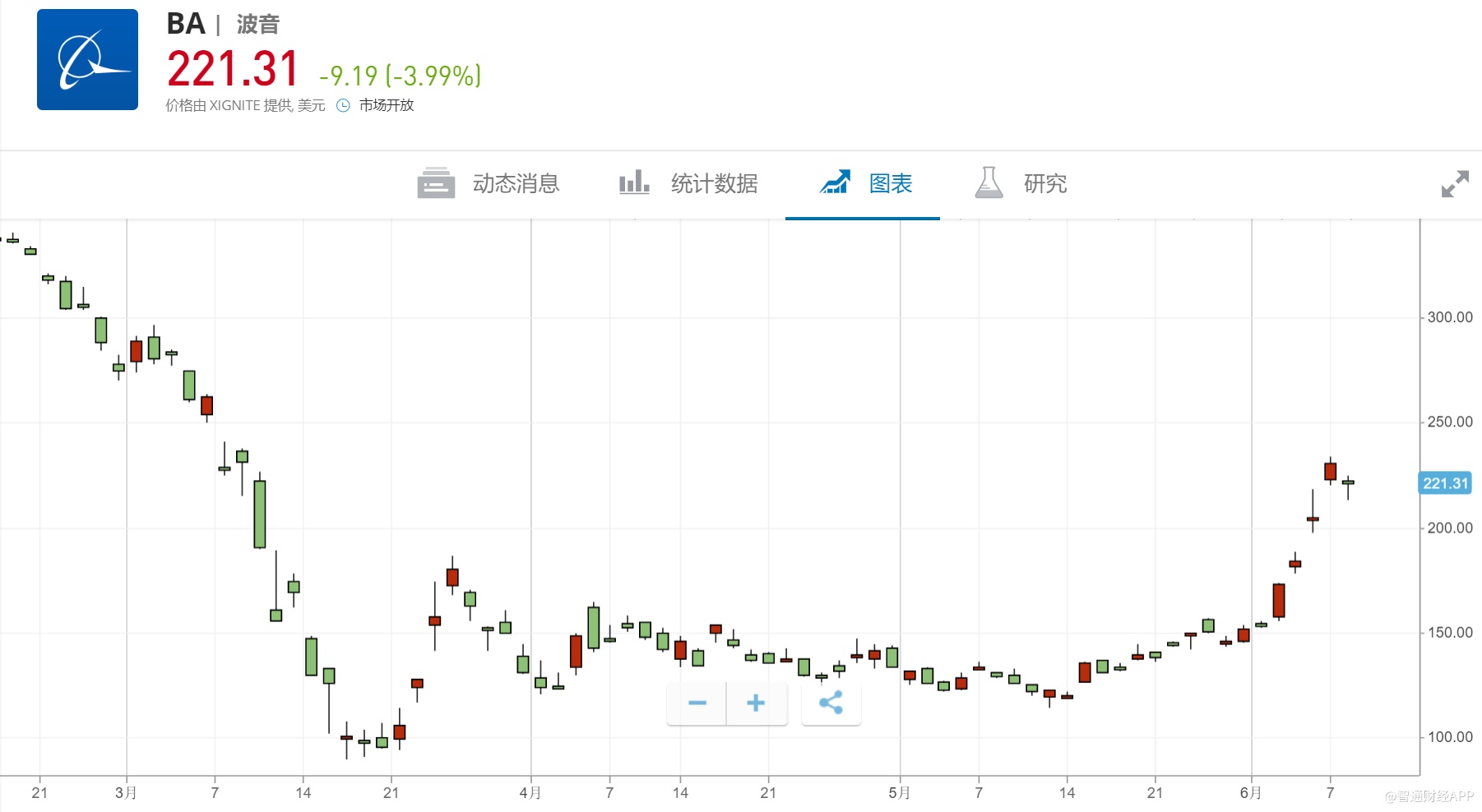 该股昨日走高,较3月盘中低位已反弹约160%。但多数分析师预计,该公司第二季度每股亏损达到2.2美元,基于航空业的暗淡前景,波音未来业绩或许还会更低。