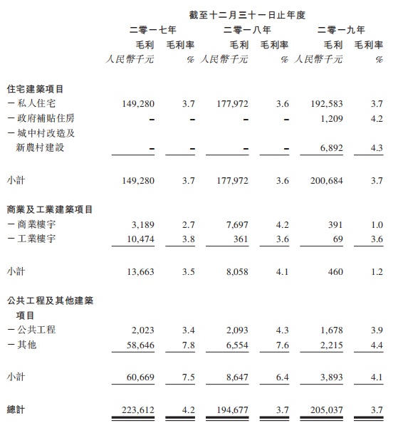 整体毛利率由2017年的约4.2%减少至2018年的约3.7%,主要由于在2018年就位于浙江省的科技园的若干土地改造建筑项目确认之收益较2017年有所减少。与2018年相比,2019年的整体毛利率保持相对稳定。