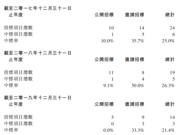 截至2017年、2018年及2019年12月31日止年度,公司透过双方协商获授之项目总数分别为35、61及41个。