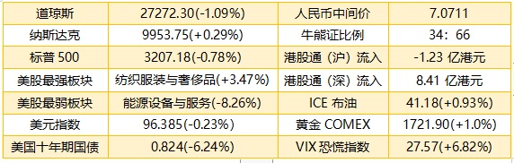 1、继周一破顶后,随着重磅科技股造好,纳指周二盘中首次突破万点大关,收盘续刷纪录高位。截至收盘,标普500指数跌25.20点,跌幅0.78%,报3207.18点;纳指涨29.00点,涨幅0.29%,报9953.75点;道指跌300.10点,跌幅1.09%,报27272.30点。港股ADR指数全日走弱,按比例计算,收报24988点,跌69.14点或0.28%。