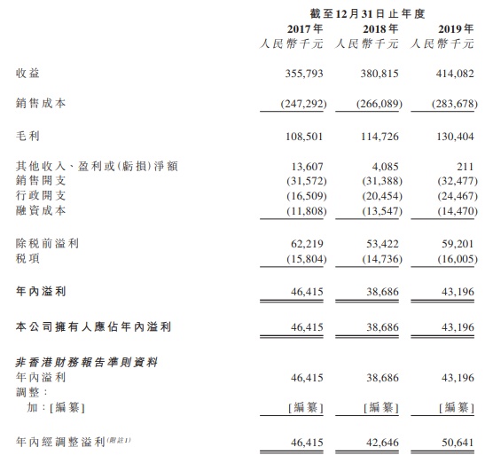 截至2017年、2018年及2019年12月31日止年度,该企业录得总收益分别约人民币3.56亿元、人民币3.81亿元及人民币4.14亿元。