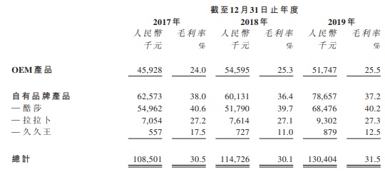 于往绩记录期间,该企业的收益主要为销售OEM产品以及销售该企业自有品牌产品,即酷莎、拉拉卜及久久王。