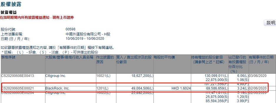 智通财经APP获悉,香港联交所最新资料显示,6月2日,贝莱德减持中国外运(00598)约4908.45万股,每股作价1.6024港元,总金额约为7865.30万港元。减持后最新持股数目约为6958.67万股,最新持股比例为3.24%。