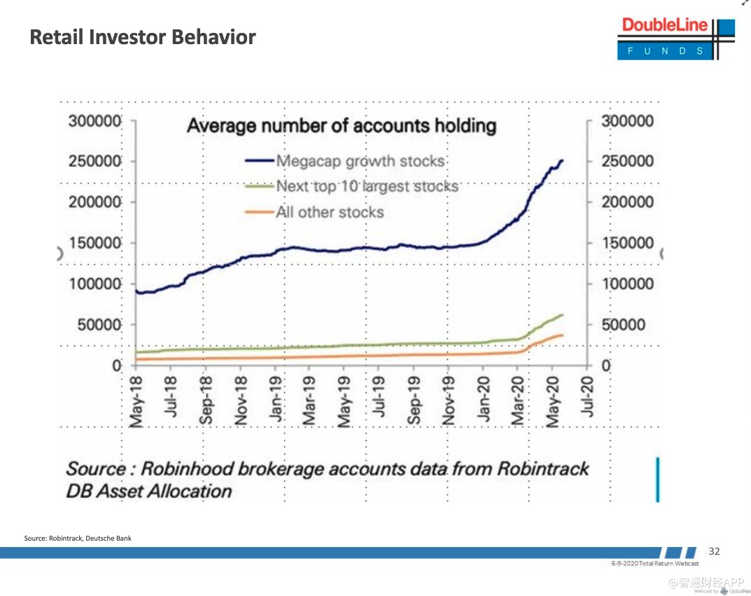 Gundlach概述了在线交易平台Robinhood的交易账户如何在从3月美股低点开始的“历史性反弹”中激增。Gundlach表示,机构资金并没有真正参与本轮美股股的上涨,但他表示很乐意看着其他人推高股市。另外值得注意的是,自去年年底在线经纪商开始提供零佣金交易以来,新的散户投资者账户激增。