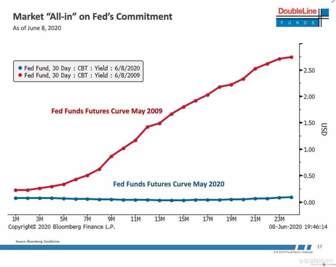 交易员将鲍威尔视为“超人”,并认为这位美联储现任主席将在未来两年内维持美联储基金的零利率。在美联储承诺方面,Gundlach的市场"All-in"模型显示,投资者正押注鲍威尔将使联邦基金期货维持在零下限附近。