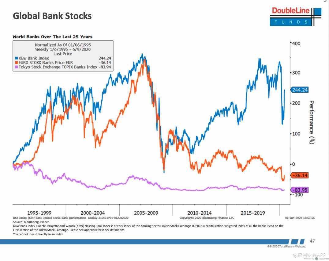另外,Gundlach还表示,负利率对所有银行而言都是最大的威胁,因为负利率对银行体系是"致命的"。下图显示欧洲央行和日本央行陷入负利率政策后,欧洲和日本的银行股在过去十年中缓慢死亡。