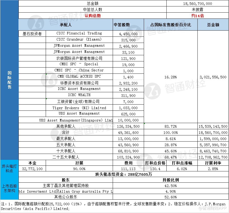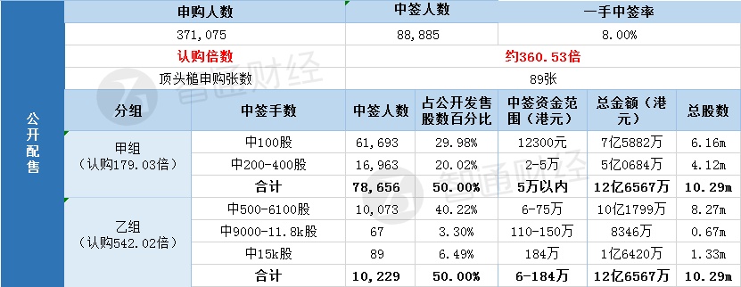 其中,公开配售申购人数371,075,一手中签率8%,认购倍数约360.53倍。