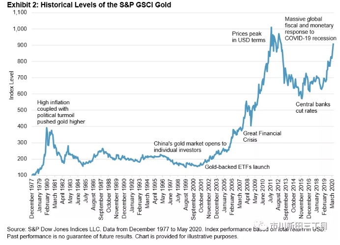 黄金在2020年上半年大出风头。在当前动荡的经济衰退期间,金价以年初至今两位数的升幅跑赢了股市和其他避险资产。从年初至5月29日,标准普尔GSCI金价回报指数的升幅达到13.94%。全球各国力度空前的财政和货币政策方面的刺激举措大幅提升了各国主权债务的规模,并引发对各国货币将会出现贬值的担忧。根据历史经验,此状况对被全球公认价值手段的黄金颇为有利。全球各国国债收益率的水平要么处于负值要么比0高不了多少再加上金价与其他资产之间的低相关度都给金价当前的上涨走势起到助力作用。