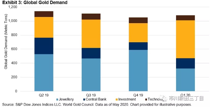 今年的黄金需求与往年相比也有所不同。据世界黄金协会统计,2020年一季度全球黄金珠宝方面的需求为过去十年来最低,但一季度投资方面的黄金需求则创下自2016年以来的最高纪录,见图3。初步统计结果显示2020年二季度的黄金市场将承继这一趋势性变化,消费者将继续减少非生活必需品方面的开支,此外黄金交易所交易基金的净申购量将创下新高。