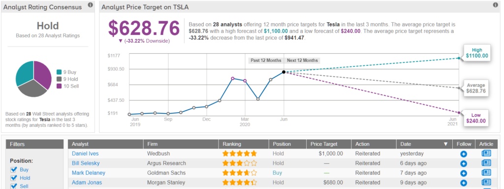 正如马斯克公司所料,市场在特斯拉的前景的问题上意见不一。9位评级为“买入”,9位“持有”,10位“卖出”,共识评级为“持有”。由于平均股价预测为628.76美元,因此较当前股价有33%的下跌空间。