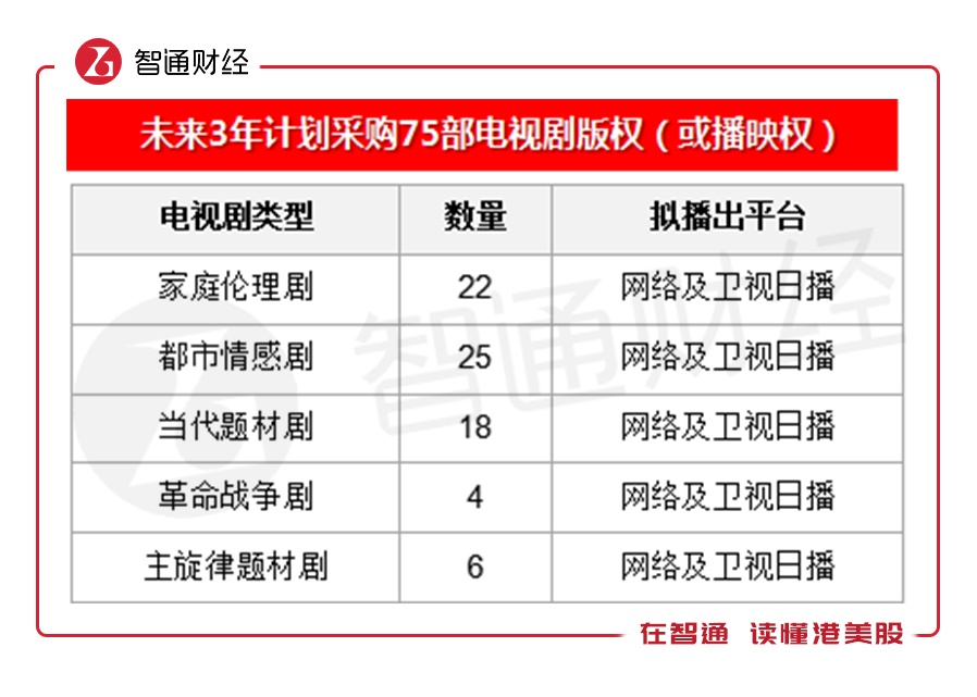 据招股书显示,未来三年,公司预期将采购75部电视剧版权(或播映权)。其中,根据规划的电视剧版权采购类型来看,家庭题材、及都市情感题材将占主要部分。