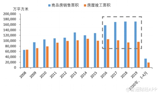 同时从2020年1至4月份的竣工面积可以看到,远低于2019年的三分之一,主要也是因为公共卫生事件影响。按照目前国内卫生事件的形势,复工复产的推进节奏加快,下半年的情况将明显好于上半年。