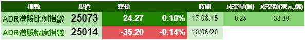 智通财经APP获悉,周三美股纳指再创新高,但道指收市下挫,港股ADR指数全日表现平稳,按比例计算,收报25073点,升24.27点或0.10%。
