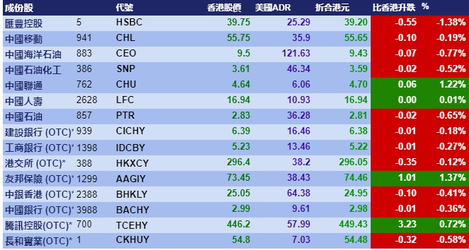 大型蓝筹个别发展,汇丰控股收报39.2元,较港收市跌0.55元;腾讯控股收报449.43元,较港收市升3.23元。