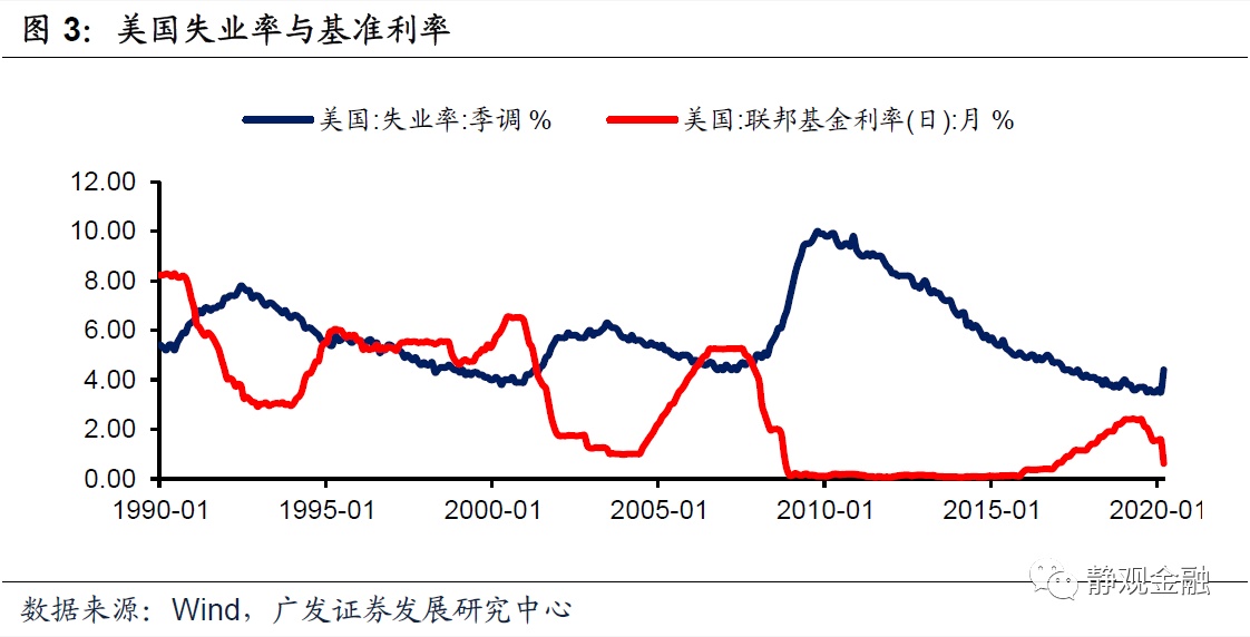 点阵图预示未来两年美联储不会加息。点阵图表明多数官员认为目前0-0.25%的低利率状态将维持到至少2022年。这与经济展望释放的信号一致。如图3所示,90年代以来美联储未在美国失业率高于7%的阶段实施过加息操作;2000年以来美联储未在失业率高于6%的阶段实施过加息操作。假若2022年底美国失业率才能降至5.5%,那么2022年之前美联储确实不太会实施加息操作。另外,美联储通胀目标是核心PCE同比达到2%,由经济展望可知美联储认为未来两年美国暂无通胀压力。