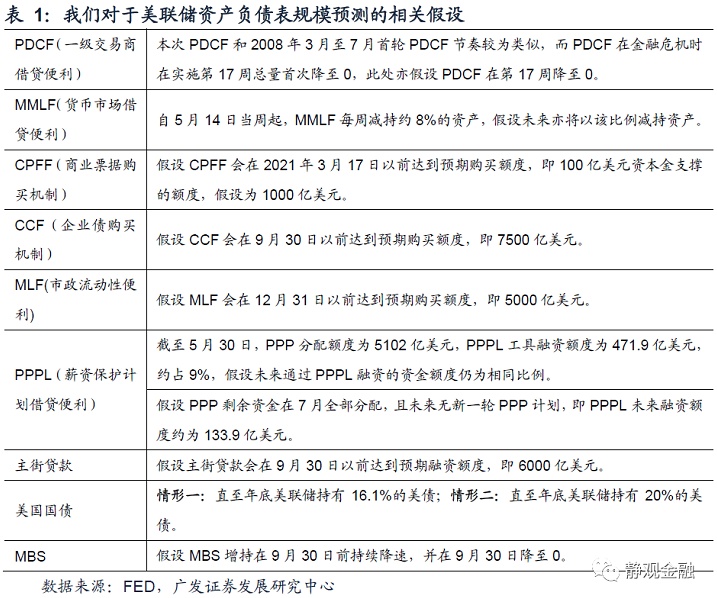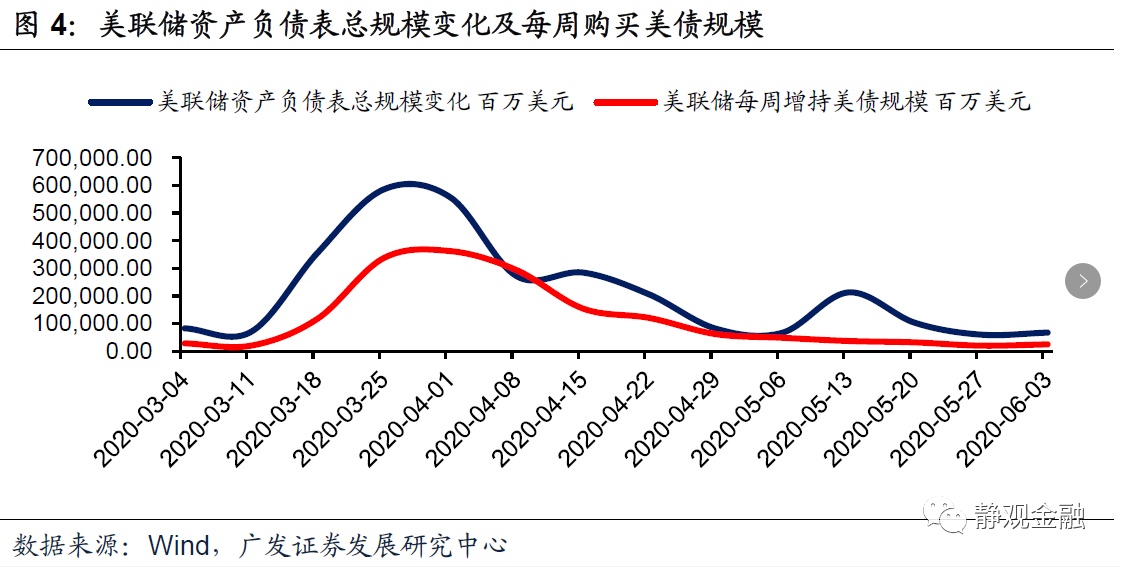 ,假定均转化为美债,则今年底美国国债总规模或攀升至26.8万亿美元(截至6月3日当周为25.7万亿美元)。公共卫生事件爆发前美联储持有美债占比为10.6%,目前为16.1%。我们曾在《公共卫生事件或加速中美角色切换》等报告中指出,为了降低美国财政支出成本,美联储会将QE常态化但目的是压低长端美债收益率。因此,QE会成为一个动态过程,美债收益率保持低位则减少购债量,一旦美债收益率显著上升则增加购债量。进而,我们对年底美联储持有美债占比做两种情形假设:一是维持当前持有比例;二是持有比例升至20%。情形一,今年底美联储资产负债表规模或将攀升至8.9万亿美元;情形二,今年底美联储资产负债表则将扩张至9.9万亿美元。