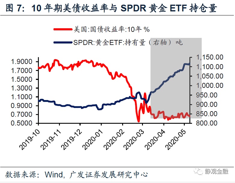 第四,货币政策的溢出效应会推升其他资产价格。由于美债配置及交易价值均下降,加上宽货币前景未变,因此会有大量资产转向美债以外的领域。近期在美债收益率波动变窄后,全球最大的黄金ETF—SPDR的黄金持有量就在明显上升,说明货币政策的溢出效应会推升美债以外的资产价格。而3月底以来美股反弹以及4月底以来美股超涨亦是如此。假若美联储实施收益率曲线管理,那么这种溢出效应将延续,短期看利好美债之外的金融资产价格,长期看确实存在资产泡沫风险。