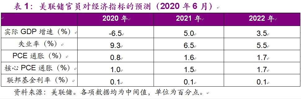 宏观数据预测:美联储对下半年美国经济的看法偏谨慎。美联储认为今年第四季度的GDP同比增速为-6.5%,失业率将高达9.3%,PCE通胀和核心PCE通胀分别只有0.8%和1%,远低于2%的政策目标(表1)。如此低的通胀预测超出了市场预期,这也说明美联储更加担心的是通缩,而不是通胀。