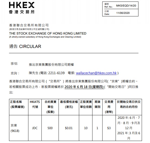 智通财经APP获悉,香港交易所今天(6月11日)宣布,将推出京东(09618)期权合约。若相关股票成功上市,新股票期权将于 2020 年6月18日 (“开始交易日”)同日推出。