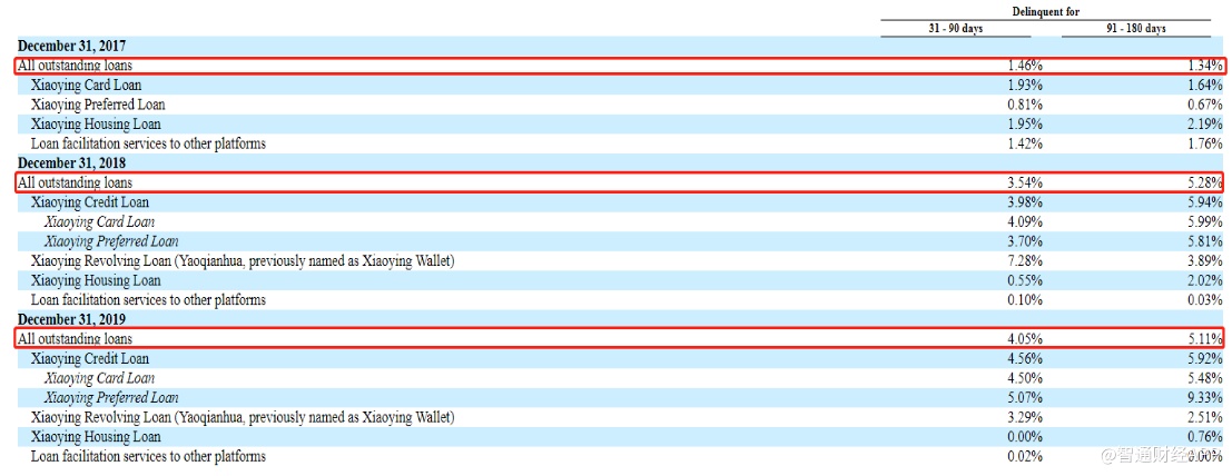 2017年至2019年,公司平台上所有逾期31-90天的未偿还贷款的拖欠率分别为1.46%、3.54%和4.05%,逐年递增。同期,逾期91-180天的未偿还贷款的拖欠率分别达到1.34%、5.28%和5.11%。
