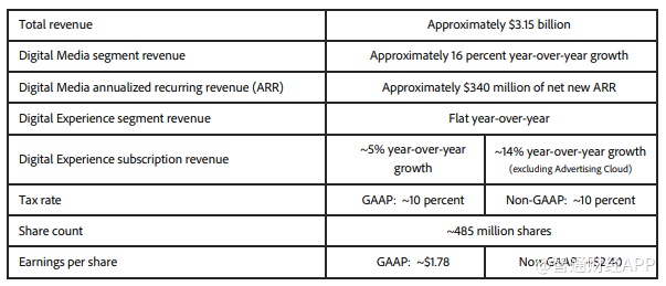 基于当前的市场状况,Adobe预期Q3营收约31.5亿美元,每股收益1.78美元,非公认会计准则下,每股收益2.4美元。