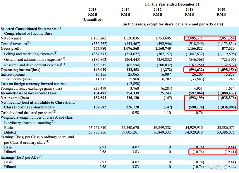 净亏损为10.39亿元,较2018年同期5.92亿元净亏损扩大75.4%; 归属于A、B类普通股股东的净亏损为10.36亿元,去年同期亏损5.9亿元;A、B类普通股摊薄后每股亏损为19.41元,上年同期亏损为10.74元。