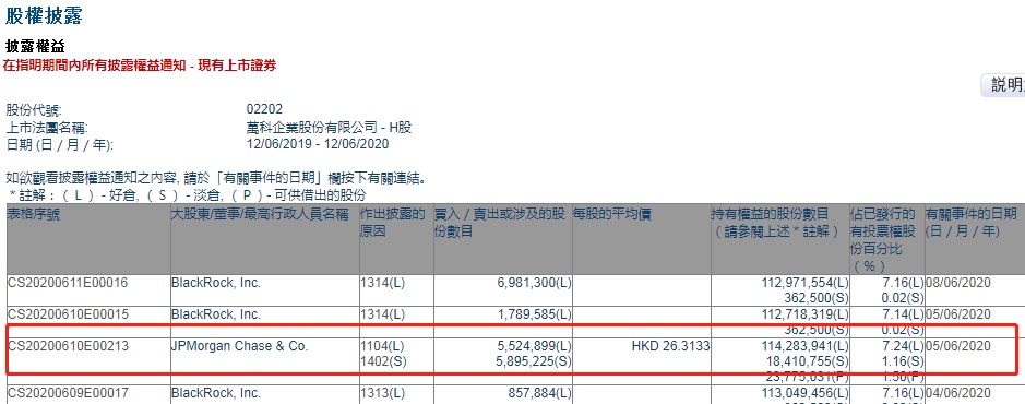 智通财经APP获悉,香港联交所最新资料显示,6月5日,小摩增持万科企业(02202)约552.49万股,每股作价26.3133港元,总金额约为1.45亿港元。增持后最新持股数目约为1.14亿股,最新持股比例为7.24%。