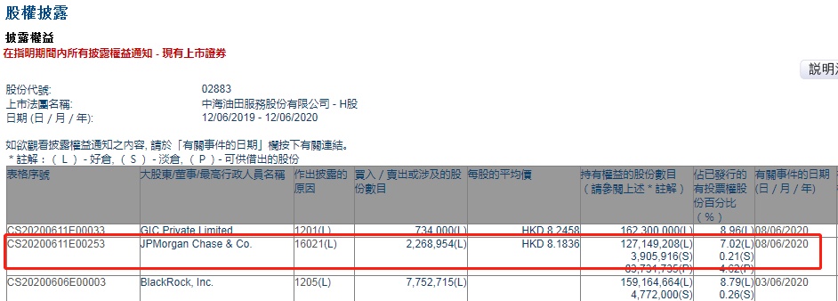 智通财经APP获悉,香港联交所最新资料显示,6月8日,小摩增持中海油田服务(02883)约226.90万股,每股作价8.1836港元,总金额约为1856.82万港元。增持后最新持股数目约为1.27亿股,最新持股比例为7.02%。