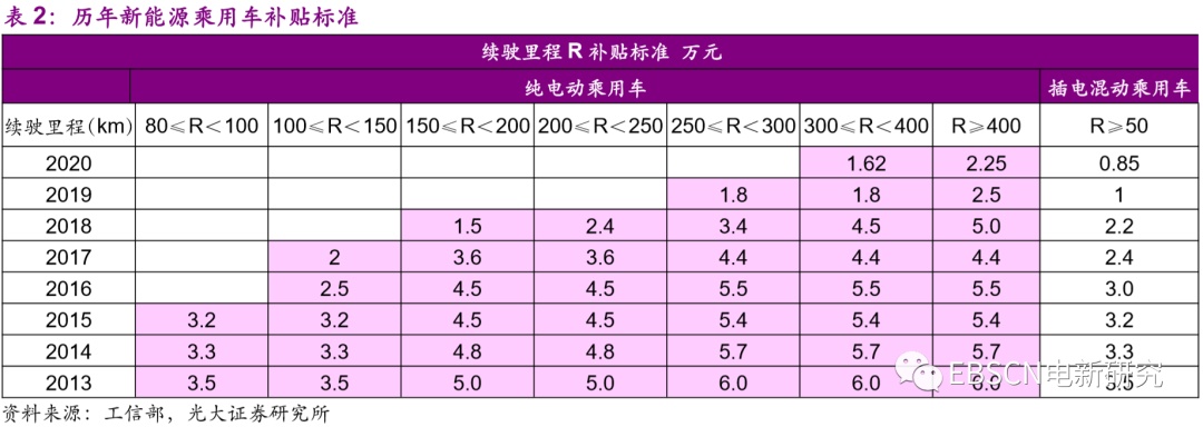 (1)政策层面,电动车补贴在2019年出现大幅退坡,尽管补贴还会延续到2022年,并且由于公共卫生事件的影响,一些地方政府也不断加码电动车财税政策,但这些补贴政策并未继续大幅提高能量密度、续驶里程门槛。