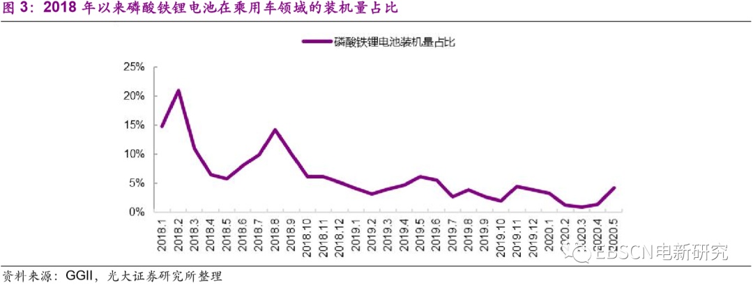 (2)技术层面,宁德时代、比亚迪等企业通过精简结构的方式提升了磷酸铁锂电池的能量密度,这使得磷酸铁锂电池与三元电池体积能量密度的差距缩小,从而使得搭载磷酸铁锂电池的乘用车的续驶里程持续提升。特斯拉国产Model 3(宁德时代电池)、比亚迪“汉”等搭载磷酸铁锂电池的新车型即将在下半年进行交付,比亚迪的刀片电池也将对外供货。